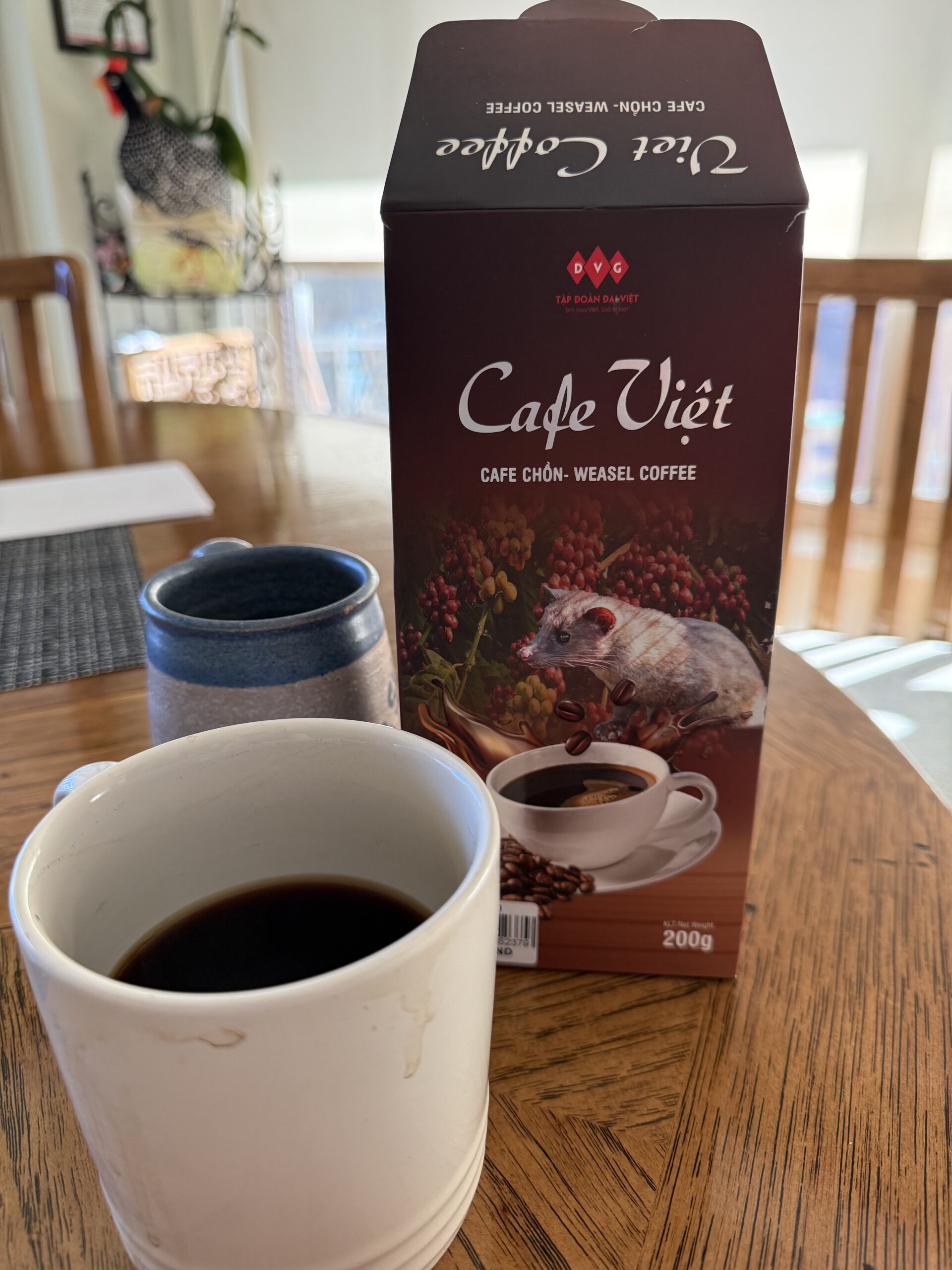 Vietnam is famous for its dark, rich coffee mixed with sweetened condensed milk. We tried it, and it was intense. We were exploring an art gallery in Vietnam, and there was a coffee bar inside that offered Weasel coffee. Ground and brewed from the beans a weasel ate, passed through, and then roasted for its exotic flavors. It was hard to define its definite charm, but for a laugh, we brought home a small bag of pre-ground coffee with the idea of sharing it with friends, but we’ve never had the courage.