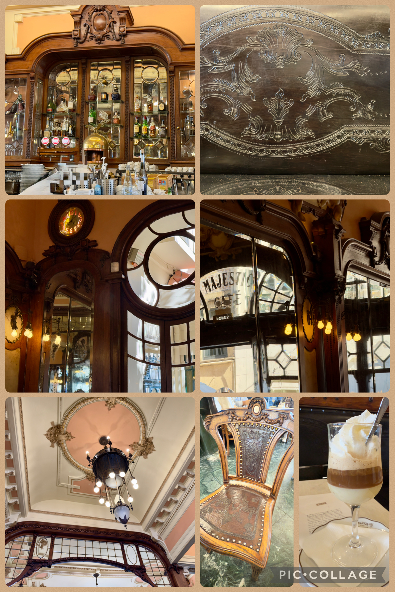 In Porto, Portugal, we had a free day to explore and made our way to the famous Majestic Cafe, which opened in 1929. We had to wait in line to get a table, but once inside, we were surrounded by elaborate art deco glasswork, leather-tooled benches, and scrolled woodwork. We were seated near the bar, where we watched a variety of drinks prepared and picked up by the waiters. Again, I was game to try something different, and I asked the waiter for “one of those.” Lost in translation, I wasn’t sure exactly what it was called, but it had cream on the bottom, coffee in the middle, and whipped cream on top. More like hot ice cream than coffee, and oh-so-pretty.
