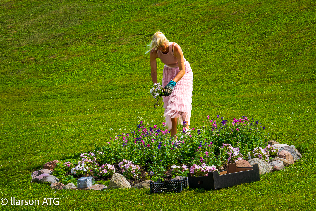 I say almost ready because she had her garden gloves on and was planting just a few more petunias in the flower bed nearest the stage, wanting everything to be perfect. This is Laura’s garden, and she welcomes visitors with” Laipni lugti,” “you are welcome,” and her goal is to offer visitors joy.