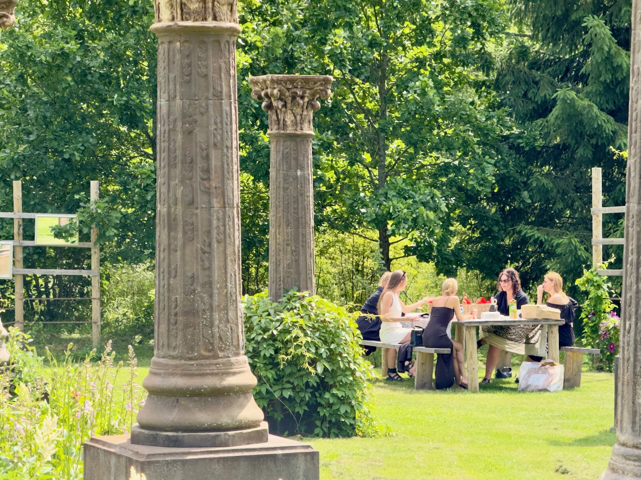 The garden has over 200 hydrangeas, and many floral beds, a glass-walled pink cottage invites you in to explore.  There is a gathering area with Corinthian columns framing the space, and on this day, a group of young women was enjoying a perfect blue-sky day, accented by orange lilies.