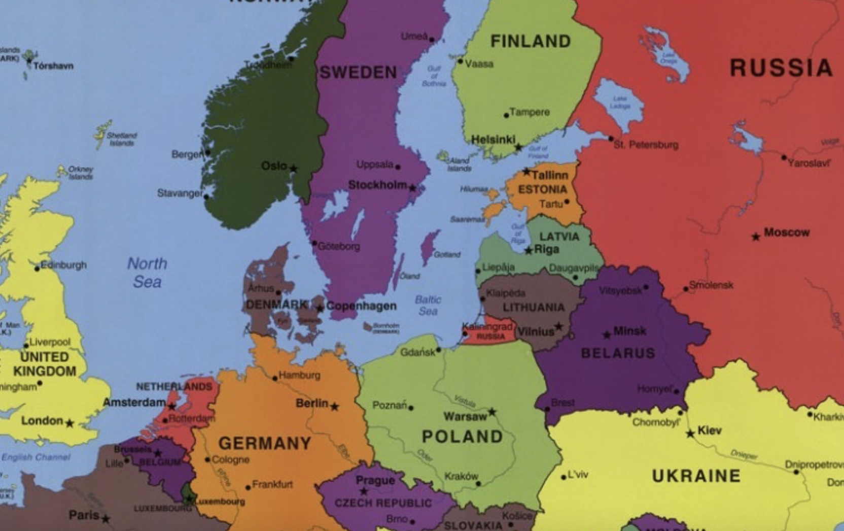 Latvia is in green, bordering Estonia and Lithuania. Ukraine in Yellow